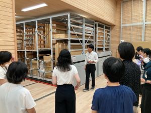 企画幹事・武藤さん、松本市美術館・渋田見さん、稲村さん、中澤さん、藤原さんのご案内で、バックヤードを見学させていただきました。展示倉庫、収蔵庫、トラックヤード、一時保管庫を見学しました。収蔵庫内は地震対策や簀子による通気対策が施され、作品の住所は作品管理システムと紐づけられているそうで、整理の行き届いた様子を興味深く拝見しました。また、大型の電動棚にも感嘆の声が上がりました。展示用の備品を保管している展示倉庫では、2021年にリニューアルされた照明の詳細についても質問が飛び交いました。